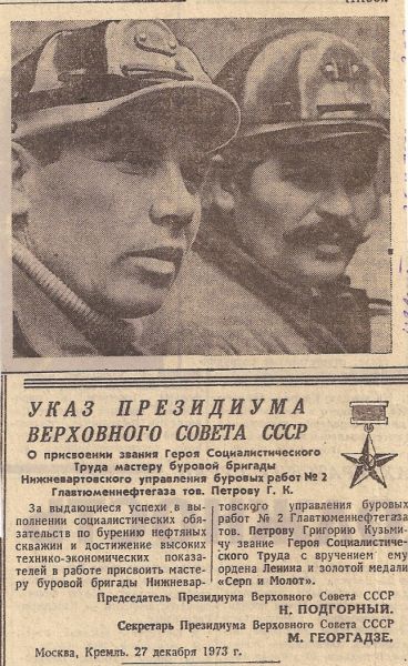 В то время было модным устраивать соревнования между бригадами, соревнуясь с бригадой Петрова. Мои бурильщики писали лозунг «Ну, Петров – ПОГОДИ!!!» - Это был комсомольский задор. Кусты располагались рядом, одновременно забуривали и побеждали бригада Петрова, в следующий раз моя бригада. Приходилось обращаться за советами к Григорию Кузьмичу по техническим вопросам и по работе с людьми, и он давал очень ценные советы».
