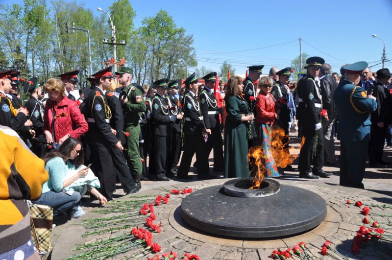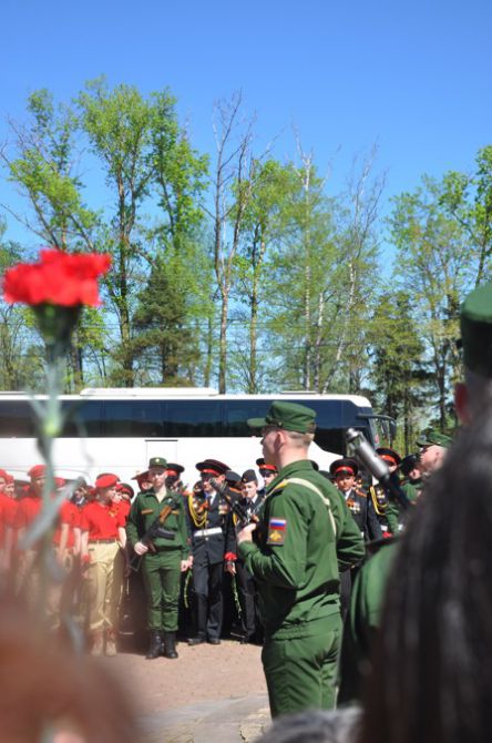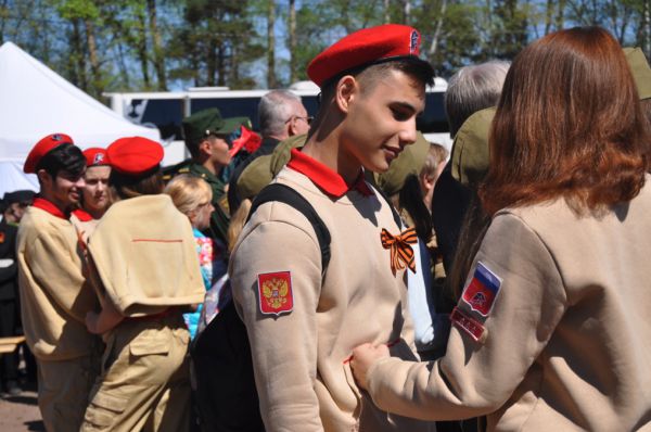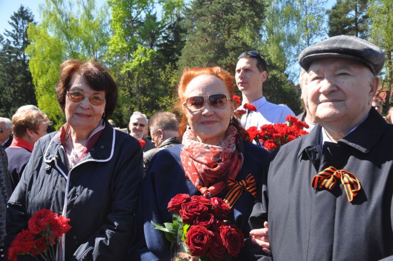 Вся территория комплекса заполнена нарядными людьми в приподнятом состоянии духа. Много ветеранов с многочисленными наградами на груди в военной форме и гражданской одежде. Звучит военная музыка и песни. Прибывшие здороваются друг с другом, заводят новые знакомства, общаются. У всех в руках гвоздики и Георгиевские ленточки. Очень много молодежи. От этого праздник становится еще более содержательным и патриотичным. Выделяются военнослужащие, офицеры и генералы, бойцы почетного караула с оружием. Украшает нашу встречу присутствие девушек с огромными белыми бантами и юношей – кадетов училищ и школьников. Вносят разнообразие юнармейцы – представители нового не военного молодежного движения в красных беретах и одежде бежевого цвета. Несколько человек отличаются от остальных национальной одеждой северных народностей.