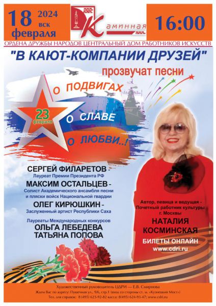 Наталия Косминская приглашает земляков 18 февраля на концерт, посвященный Дню защитника Отечества. Концерт состоится в Центральном Доме работников искусств.