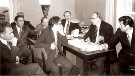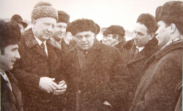 Министр нефтяной промышленности В.Д. Шашин, начальники тюменских главков В.И. Муравленко и В.П.Курамин на Самотлоре, 1975г.