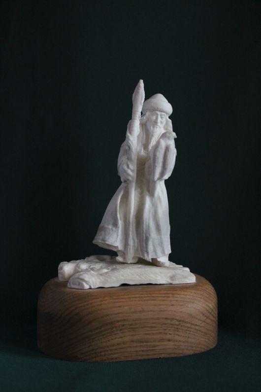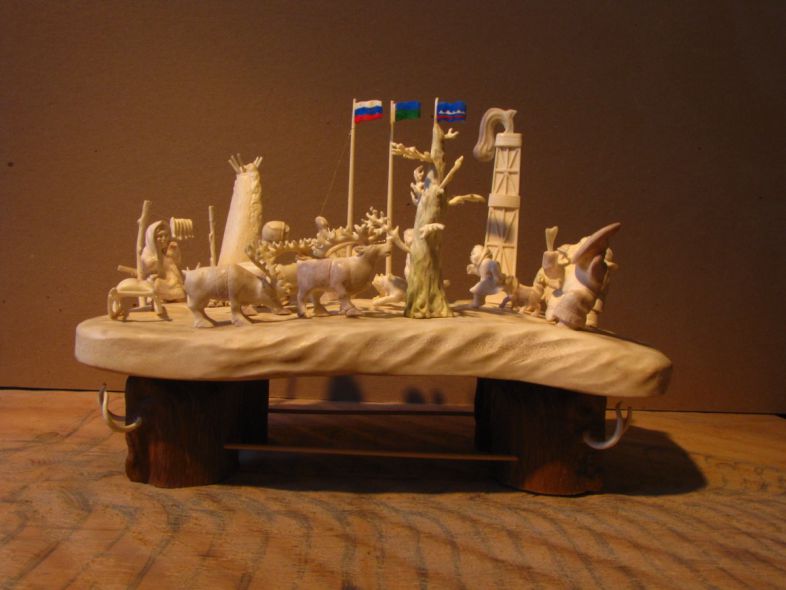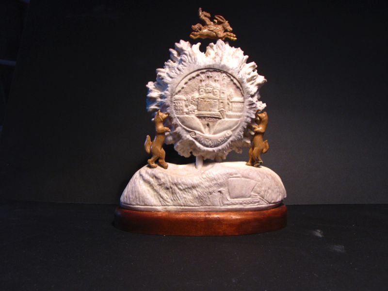 Скульптурная композиция состоит из двух частей; верхняя часть выполнена из естественной формы корневища лосиного рога, олицетворяет Косматое Облако-Солнце, на котором в кругу выгравирован главный «фасадный» вид древнего Тобольска. В старину именно на светлых облаках над холмами впервые привиделся Белый город. В нижней части изображения  на картуше есть надпись «Тобольск». На обратной стороне Солнца имеется изображение Белой Совы-Филина, олицетворяющее достопримечательность Западной Сибири – Абалакский мужской монастырь, который находится в старинном селе Абалак, что в переводе с татарского означает  Белая Сова. Этих птиц в той местности до сих пор множество. По старым преданиям, это души вдов погибших воинов.  С обеих сторон Солнца установлены два Соболя из мамонтовой кости естественной окраски. Соболи изображались в допетровском Сибирском (Тобольском) гербе и условно означали соединение России с Азиатской сибирской стороной. Сверху по Солнцу скачет легендарный Конек-Горбунок, автор одноименной  книги П.Ершов жил в Тобольске. На Коньке сидит Иван с пером Жар-Птицы в руке, миниатюра символизирует Успех, Удачу. Солнце-Облако установлено на подставке-холме из лосиного рога, то есть это как бы Алафеевские горы, на которых на Троицу был основан приплывшими на ладьях воеводами город Тоболеск–Ладейный, потому внизу костяной подставки есть изображение ладьи. В целом, композиция представляет изображение одного из немногих городов мира, которые стоят на холмах (Рим, Москва и другие). Костяная подставка укреплена на деревянной основе (береза).