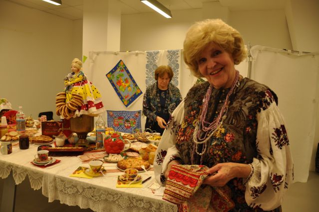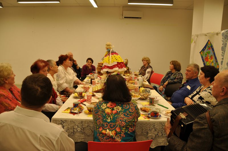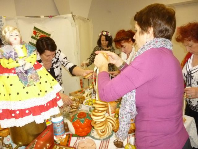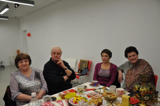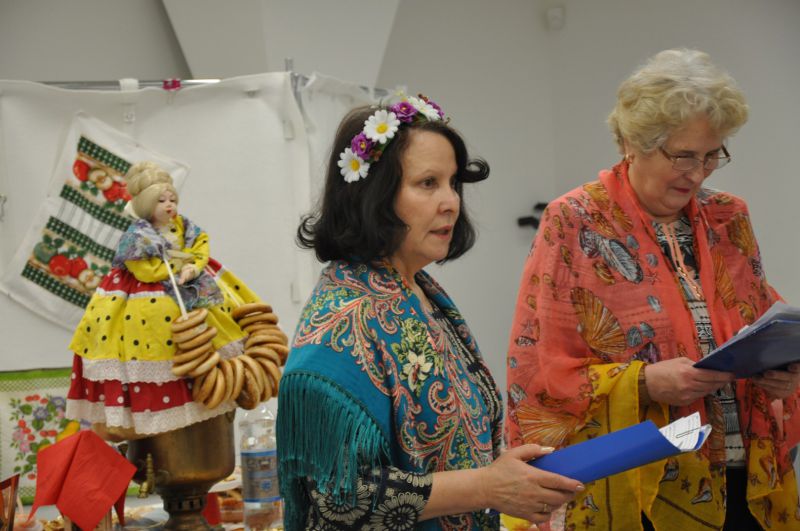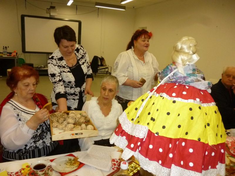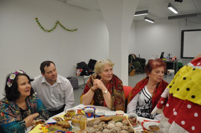 И вновь мы собрались в уютном зале библиотеки №129 на Братиславской. Для проведения мероприятия, которое организовала Раиса Павловна Кудряшова, участники принесли реквизит для воссоздания дружеской домашней обстановки: большой медный самовар с куклой наверху, красивый заварной чайник, бублики, пряники, торты, пирожное, печенье, мед, варенье, пироги с яблоками, пиццу и многое другое.