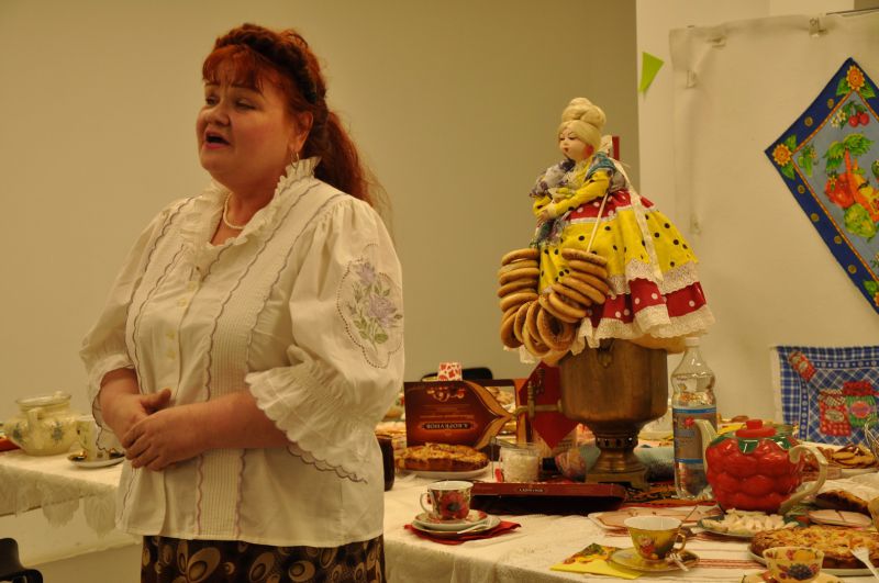 Виктор Одинцев прочитал стихотворение о том, как в начале появления чайной заварки в России повара готовили господам чай. Некоторые думали, что чайные листья нужно использовать как капусту или как приправу при варке супа или борща. Наталья Архиповна Кашникова исполнила замечательные бытовые песни нашего Отечества.