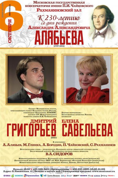 6 октября, в пятницу, в 19 часов в Рахманиновском зале консерватории по адресу Большая Никитская, 13 состоится концерт, посвященный 230-летию Александра Алябьева. Исполнитель – Дмитрий Григорьев, победитель конкурса имени Чайковского.